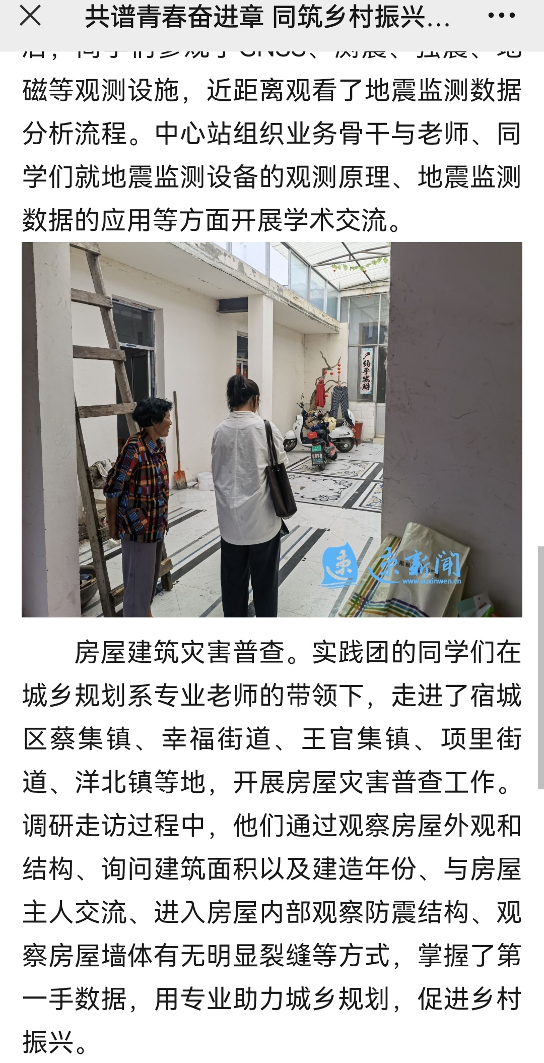 房屋建筑灾害普查。乡村振兴实践团在城乡规划系专业老师的带领下,走进了宿迁市蔡集镇、幸福街道、王官集镇、南蔡乡、项里街道、洋北镇等地开展了宿迁市房屋灾害普查工作。调研走访过程中,同学们观察房屋外观和结构、询问建筑面积以及建造年份、与房屋主人交流进入房屋内部观察防震结构,观察房屋墙体有无明显裂缝……。掌握第一手数据,用专业助力城乡规划,促进乡村振兴。