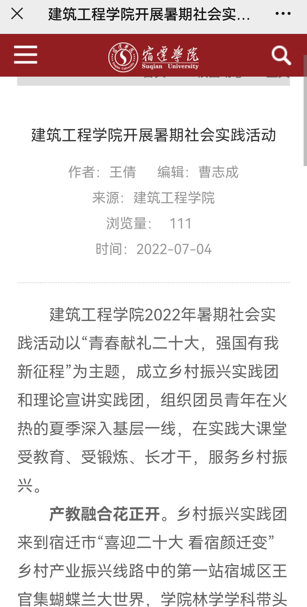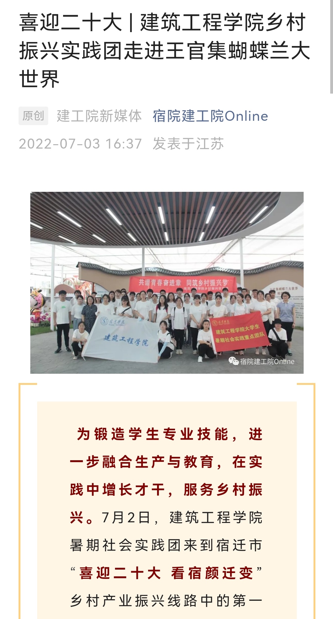 建筑工程学院2022年暑期社会实践活动以“青春献礼二十大,强国有我新征程”为主题,成立乡村振兴实践团、理论宣讲实践团与博爱青春实践团,组织团员青年在火热的夏季深入基层一线,在实践大课堂受教育、经受锻炼、增长才干,服务乡村振兴。