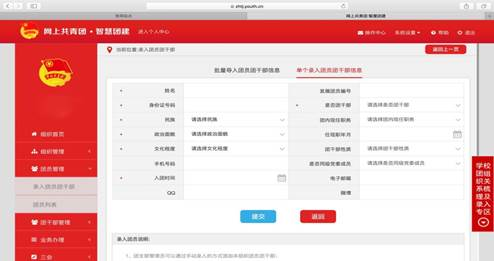 【团员管理】、【录入团员团干部】、【单个录入团员团干部信息】、【填写相关信息并提交】
